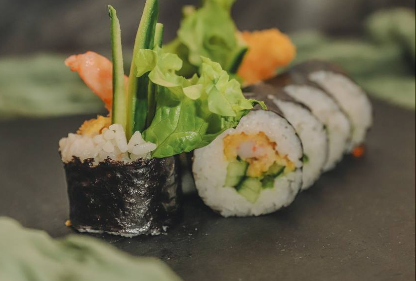 Состав: рис, нори, темпурная креветка, огурец, морковь, сливочный сыр, спайс соус