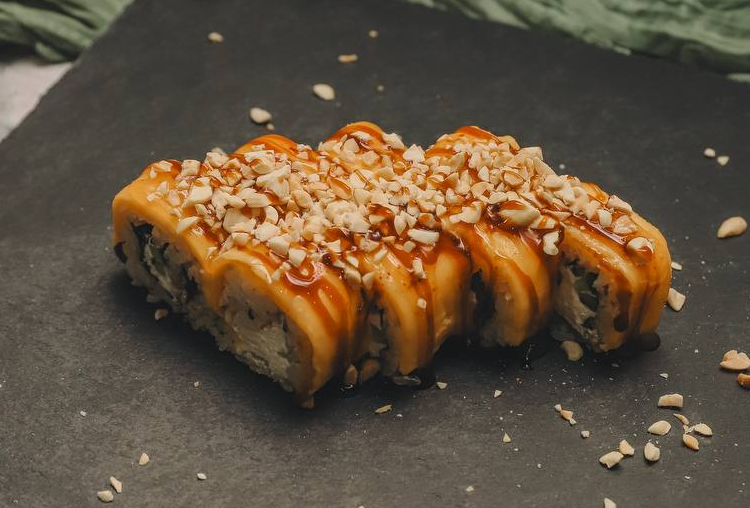 Состав: рис,нори,сыр,манго соус,унаги,арахис,креветка