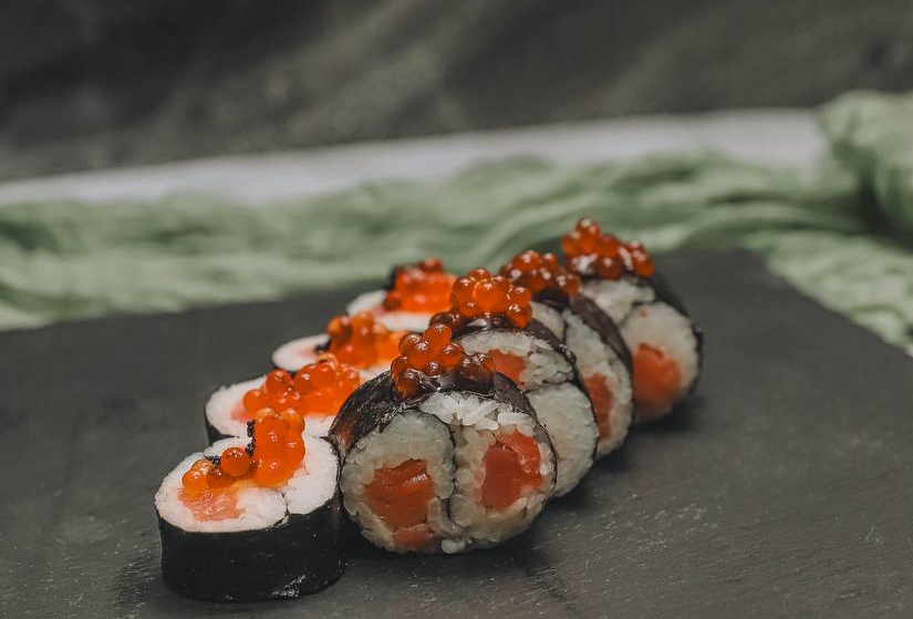 Состав: рис, нори, лосось, сливочный сыр, зеленый лук, черная икра